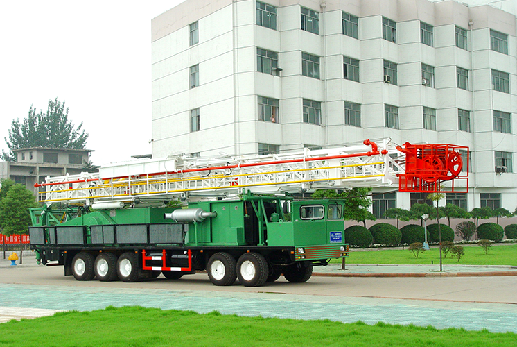 4. 井架采用前開口雙節套裝桅形井架,前傾或直立,液壓缸起放及伸縮,配有防風繃繩及防翻繃繩。